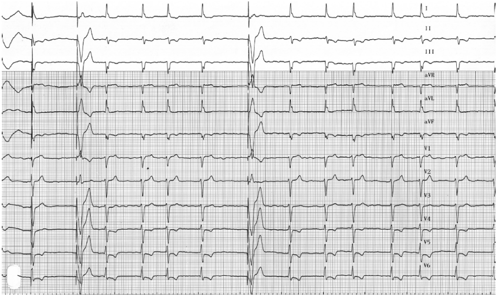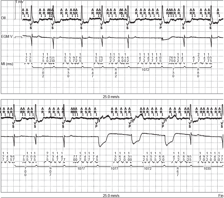 Ces tracés montrent le fonctionnement normal d’un stimulateur double chambre lors d’un épisode de fibrillation auriculaire; la programmation de la commutation de mode permet un retour à une fréquence cardiaque plus physiologique que sur les tracés précédents. Pour éviter une chute brutale de la fréquence ventriculaire, le retour à la fréquence de base ou à la fréquence asservie est progressif.