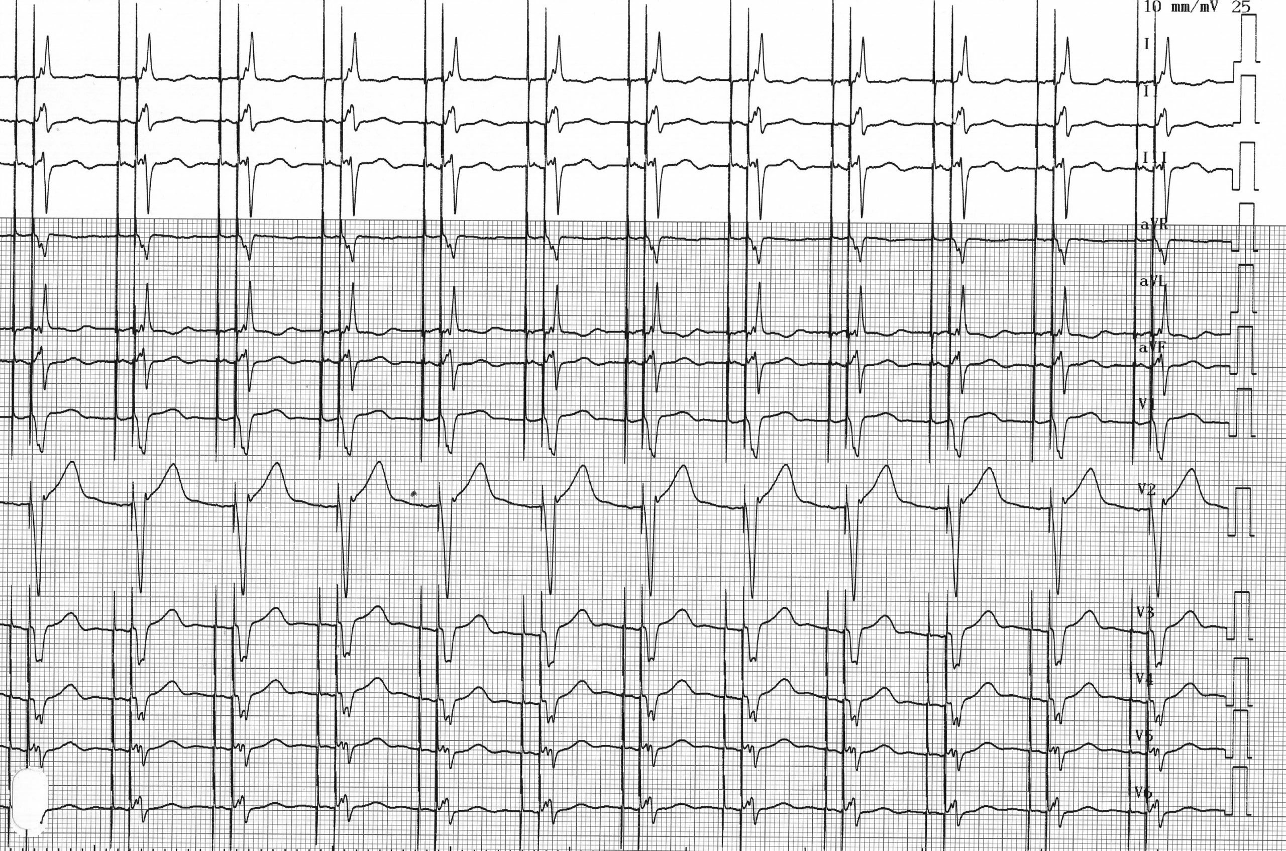 La programmation du mode DDD semble donc satisfaisante chez ce patient. Cependant, le suivi permettrait probablement de mettre en évidence un pourcentage de stimulation ventriculaire proche des 100%. Cela correspondrait donc à un fonctionnement jugé normal et approprié. L’analyse en 0D0 a toutefois révélé que ce patient présente une conduction AV correcte. Une des priorités dea la programmation d’un stimulateur est d’éviter toute stimulation ventriculaire droite inutile.