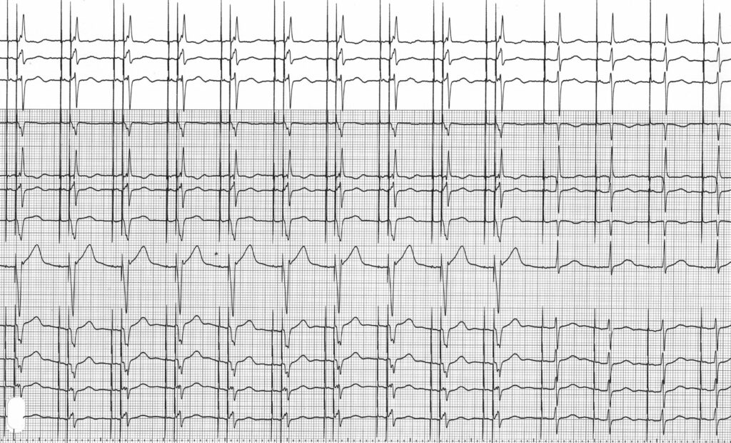 Initialement, le stimulateur est programmé en mode DDD avec un tracé identique au précédent; en fin de tracé, programmation du mode MVP et reprise d’une conduction atrio-ventriculaire spontanée (stimulation atriale et détection ventriculaire);