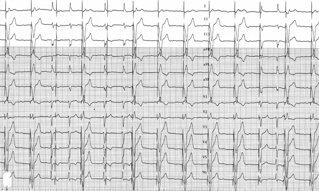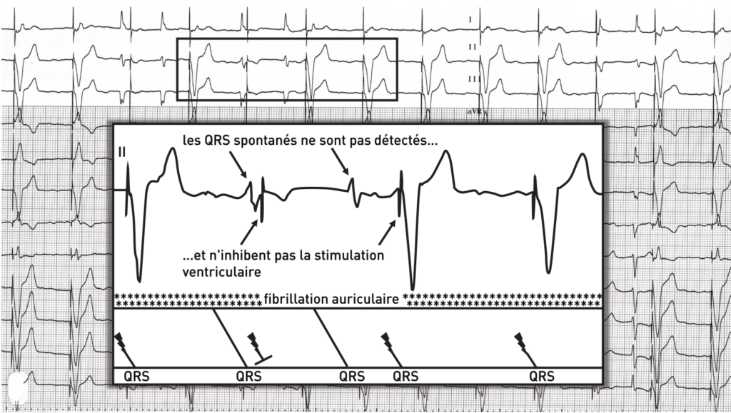 Ce tracé révèle une sous-détection ventriculaire entrainant parfois une stimulation en période vulnérable. En l’absence de détection correcte, le stimulateur fonctionne en mode asynchrone avec impossibilité d’inhibition sur les ventricules spontanés. Il existe un risque théorique faible mais non nul d’induction d’une arythmie ventriculaire polymorphe maligne compromettant la survie du patient. De plus cette stimulation inutile entraine une consommation d’énergie préjudiciable pour la durée de vie de l’appareil.