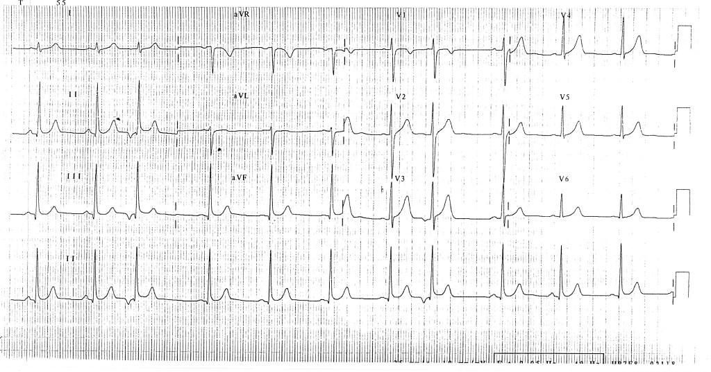 Sur ce tracé, l’extrasystole atriale nait dans la partie basse de l’oreillette droite près du nœud auriculo-ventriculaire ce qui explique la négativité dans les dérivations inférieures et l’aspect de P’R relativement court.