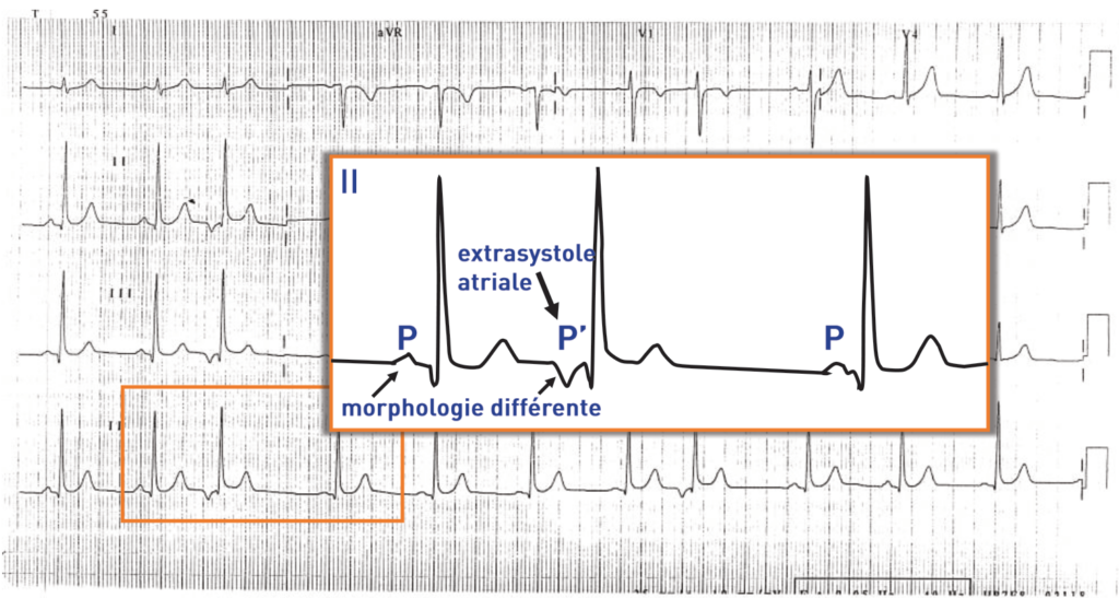 Une extrasystole atriale (onde P’) correspond à une activité atriale prématurée et ectopique c’est à dire se produisant précocement par rapport à l’activité sinusale (P) et naissant en dehors du nœud sinusal. Le cycle PP’ est donc plus court que le cycle PP et la morphologie de l’onde P’ (variable en fonction de l’origine) est différente de celle de l’onde P sinusale.