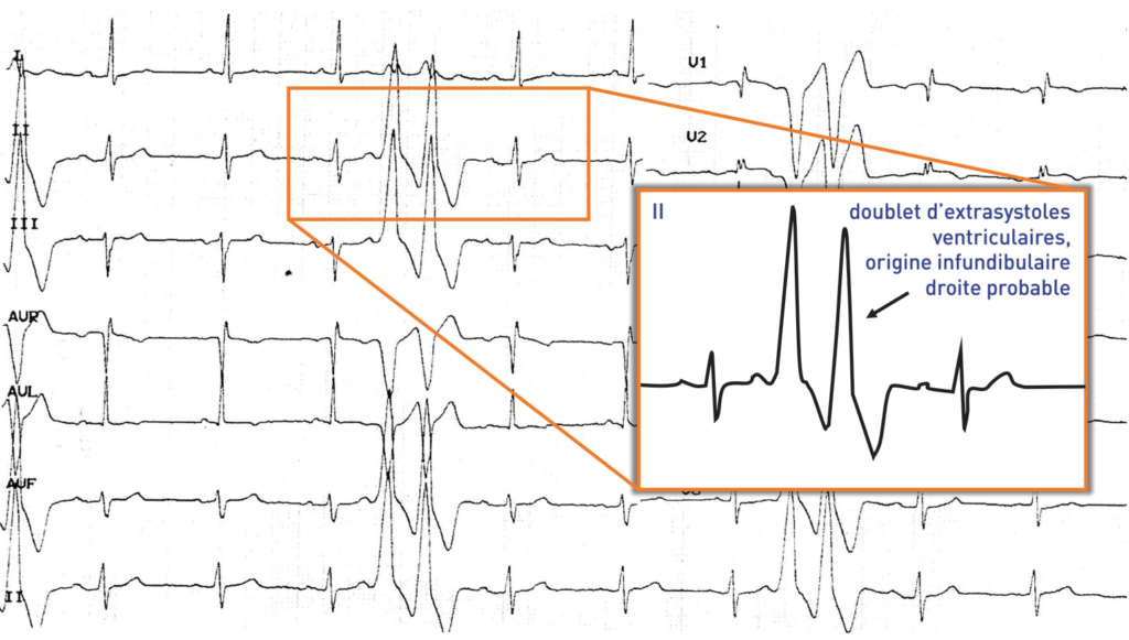 Rythme sinusal (onde P positive en DI, DII et négative en aVR); PR normal; QRS fin; ondes T négatives en V1-V2; Doublets d’extrasystoles ventriculaires: battements prématurés à QRS large, monomorphes (même aspect des 2 extrasystoles consécutives); origine infundibulaire droite probable (positivité dans les dérivations inférieures et en V6, négativité en V1, transition tardive du QRS en V4);