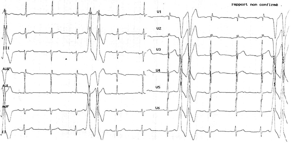 Rythme sinusal (onde P positive en DI, DII et négative en aVR); PR normal; QRS fin; ondes T négatives en V1-V2; Doublets d’extrasystoles ventriculaires: battements prématurés à QRS large, monomorphes (même aspect des 2 extrasystoles consécutives); origine infundibulaire droite probable (positivité dans les dérivations inférieures et en V6, négativité en V1, transition tardive du QRS en V4);
