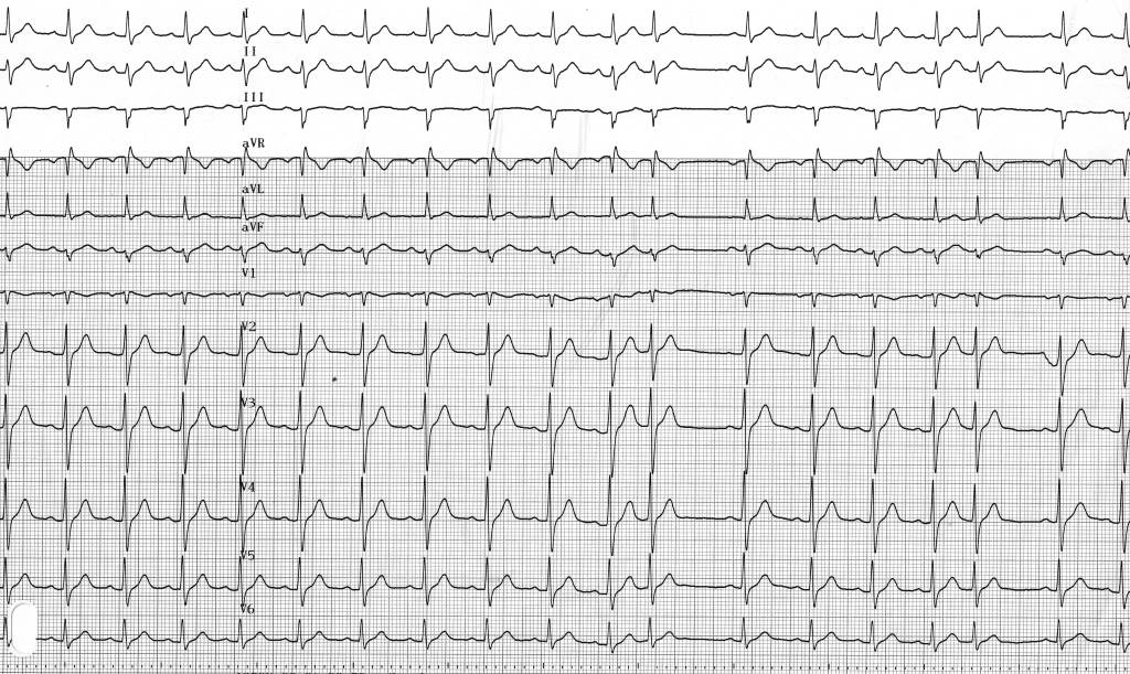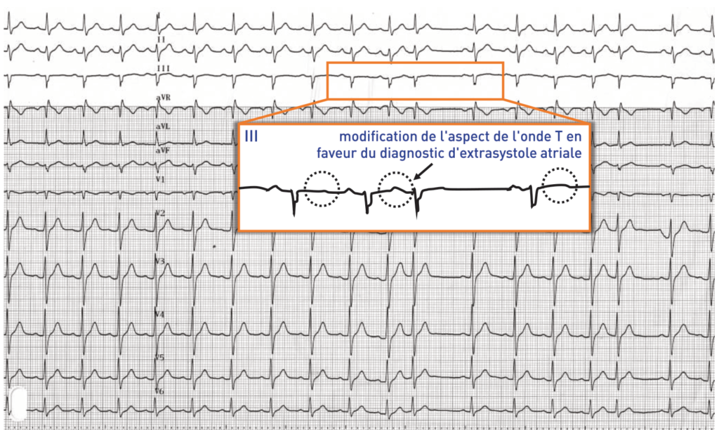 Une extrasystole atriale peut survenir comme sur ce tracé durant la repolarisation ventriculaire (sur l’onde T suivant le complexe QRS précédent). L’électrocardiogramme de surface enregistre au niveau de la peau, l’intégralité des potentiels générés par le coeur. En raison d’une masse plus faible, l’amplitude des signaux générés par l’oreillette est beaucoup plus faible que celle des signaux générés par le ventricule (complexe QRS ou onde T). De surcroit, la pente (“molle”) de ces 2 signaux (onde P et onde T) est relativement similaire et significativement différente par rapport à celle d’un QRS (pente plus aiguë). Le diagnostic d’extrasystole atriale peut donc parfois être difficile et une analyse minutieuse de toutes les dérivations est nécessaire.