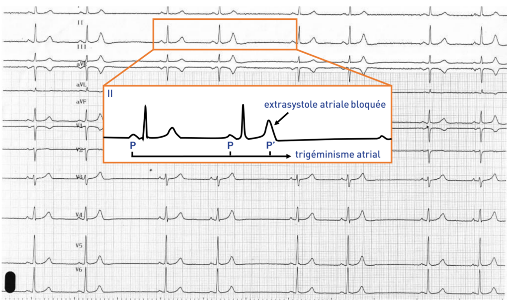 Le couplage de l’extrasystole est fixe avec une alternance entre 2 activités sinusales et une extrasystole. Il s’agit donc d’un trigéminisme.
