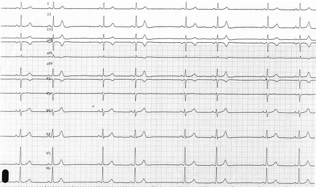 Ce patient présentait des extrasystoles atriales bloquées entrainant une bradycardie diagnostiquée par la prise de pouls. Il s’agit donc d’un trouble de l’excitabilité et non d’un trouble de conduction. Il n’existe pas chez ce patient de dysfonction sinusale et l’indication d’implantation d’un stimulateur cardiaque ne doit pas être retenue. En effet, le ralentissement de fréquence est en rapport avec la pause sinusale physiologique suivant l’extrasystole, le traitement à proposer étant éventuellement l’introduction d’un antiarythmique. Ce tracé montre que devant tout tracé évocateur de dysfonction sinusale, une analyse minutieuse du tracé est nécessaire, avec une attention particulière pour la morphologie de l’onde T et de ses variations, afin d’éliminer le diagnostic différentiel représenté par l’existence d’extrasystoles atriales bloquées.