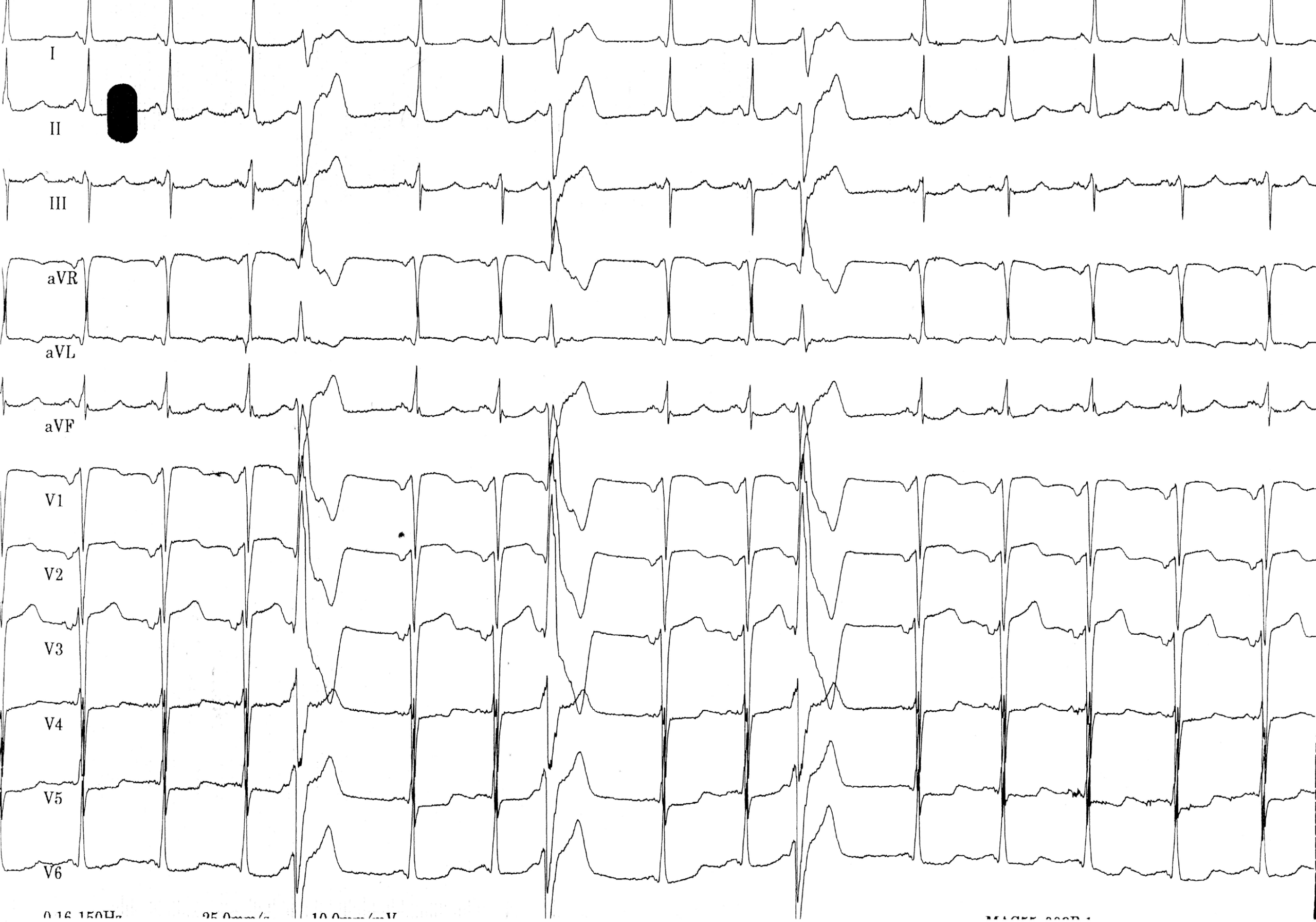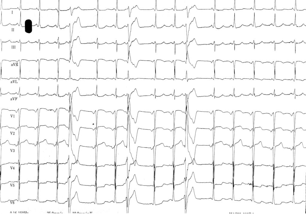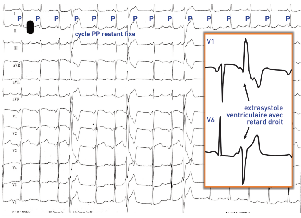 Rythme sinusal (onde P positive en DI, DII et négative en aVR); hypertrophie auriculaire gauche (onde P large, aspect bifide et fragmenté en DII, DIII, aVF, V5, V6); PR normal; QRS fin avec séquelle de nécrose antérieure étendue (onde q en DI, aVL, V6 et rabotage des ondes R en V1-V4); Extrasystoles ventriculaires provenant du ventricule gauche: activité ventriculaire prématurée (en fin de l’onde T précédente), à QRS large (QRS > 160 ms), avec retard droit (QRS positif en V1 et négatif en V6), axe hyper-droit (QRS négatif en DI et dans le territoire inférieur) suggérant une origine ventriculaire gauche, aspect fragmenté (suggérant l’existence d’une cardiopathie sous-jacente); présence d’une activité atriale dans l’onde T suivant l’extrasystole probablement d’origine sinusale et non pas rétrograde (morphologie identique à l’activité sinusale, positive en DI, DII et négative en avR, avec un cycle PP restant fixe);