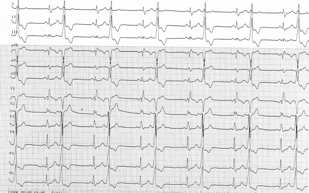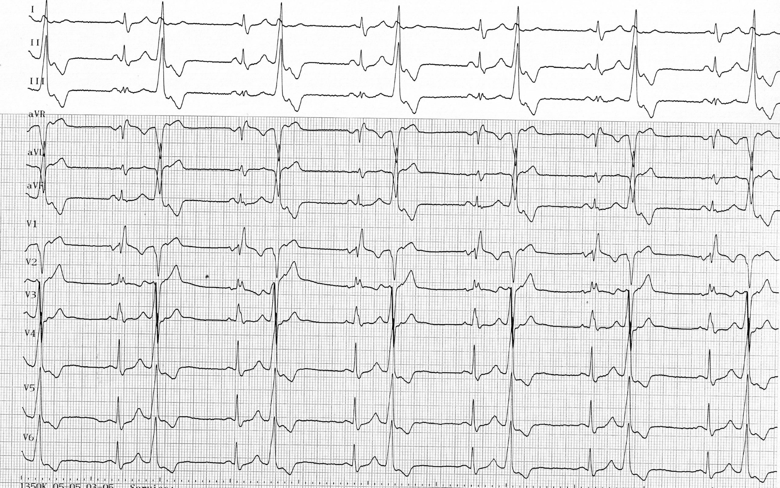 Alternance entre 2 complexes QRS 1) complexe d’origine sinusale (onde P positive en DI, DII, V5, V6 et négative en aVR) avec intervalle PR normal (120 ms); QRS large avec aspect de bloc de branche droit 2) extrasystole ventriculaire bien voltée, non fragmentée, retard gauche; il s’agit donc d’un bigéminisme ventriculaire avec alternance entre un QRS conduit et une extrasysole;