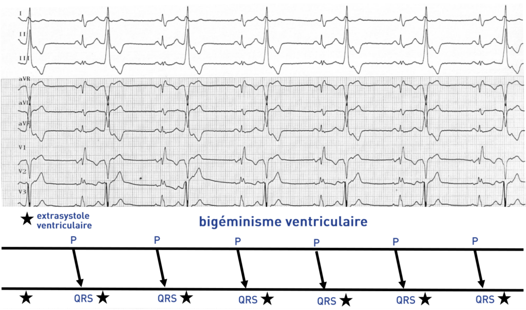 Le nombre d’extrasystoles sur une journée ne constitue pas un facteur pronostic majeur. La charge en extrasystoles est en revanche déterminante concernant l’éventuel retentissement sur la fonction cardiaque. Le bigéminisme observé chez ce patient peut, si il se maintient, être responsable du développement d’une véritable cardiopathie rythmique. La caractérisation de l’extrasystolie peut donc être complétée par la réalisation d’un Holter-ECG des 24 heures qui permet une évaluation quantitative avec mesure de la charge en extrasystoles sur 24 heures, mais également qualitative avec le nombre de morphologies différentes (extrasystoles monomorphes ou polymorphes), le couplage, l’existence de formes répétitives (présence de doublets, triplets, et/ou de salves), le lien avec la fréquence cardiaque (mécanisme catécholergique, vagal ou indéterminé), l’alternance jour-nuit (distribution nocturne et diurne). Plus que le nombre absolu d’extrasystoles, il semble que la présence d’activités répétitives à couplage très courts, permettent d’identifier les patients les plus à risque.