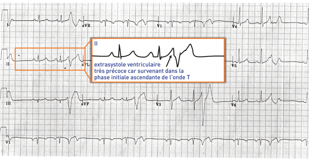 L’existence d’un couplage court entre l’extrasystole ventriculaire et le complexe QRS précédent représente un indicateur majeur de risque rythmique. Il est d’usage de définir un couplage court en fonction du timing par rapport à l’onde T du complexe précédent. L’existence d’une ESV survenant dans la phase ascendante ou au sommet de l’onde T (phénomène R sur T) peut induire une arythmie ventriculaire maligne (torsade de pointe à couplage court ou fibrillation ventriculaire) car elle survient durant la phase vulnérable. Les mécanismes de déclenchement d’une fibrillation à l’étage atrial et à l’étage ventriculaire sont probablement très proches avec l’interaction entre un facteur déclenchant et un substrat. L’importance du réseau de Purkinje dans le déclenchement de certains épisodes de fibrillation ventriculaire a été récemment suggérée. Les fibres différenciées du réseau de Purkinje peuvent survivre après la survenue d’un infarctus transmural et développer des propriétés électrophysiologiques arythmogènes. Tout comme les veines pulmonaires dans la fibrillation auriculaire focale, le réseau de Purkinje peut constituer la source de la gâchette initiatrice de l’arythmie ventriculaire et pourrait en favoriser l’entretien. L’aspect retrouvé sur ce tracé correspond à une extrasystolie provenant du réseau de Purkinje ventriculaire droit distal: les extrasystoles sont très précoces, relativement larges avec retard gauche. Les extrasystoles provenant du réseau de Purkinje ventriculaire droit sont comme chez ce patient le plus souvent monomorphes avec un aspect de retard gauche, axe supérieur et ont une durée moyenne d’environ 140 ms. Celles provenant du réseau de Purkinje ventriculaires gauche sont habituellement polymorphes, également très précoces avec un QRS plus fin caractéristique (120 ms en moyenne).