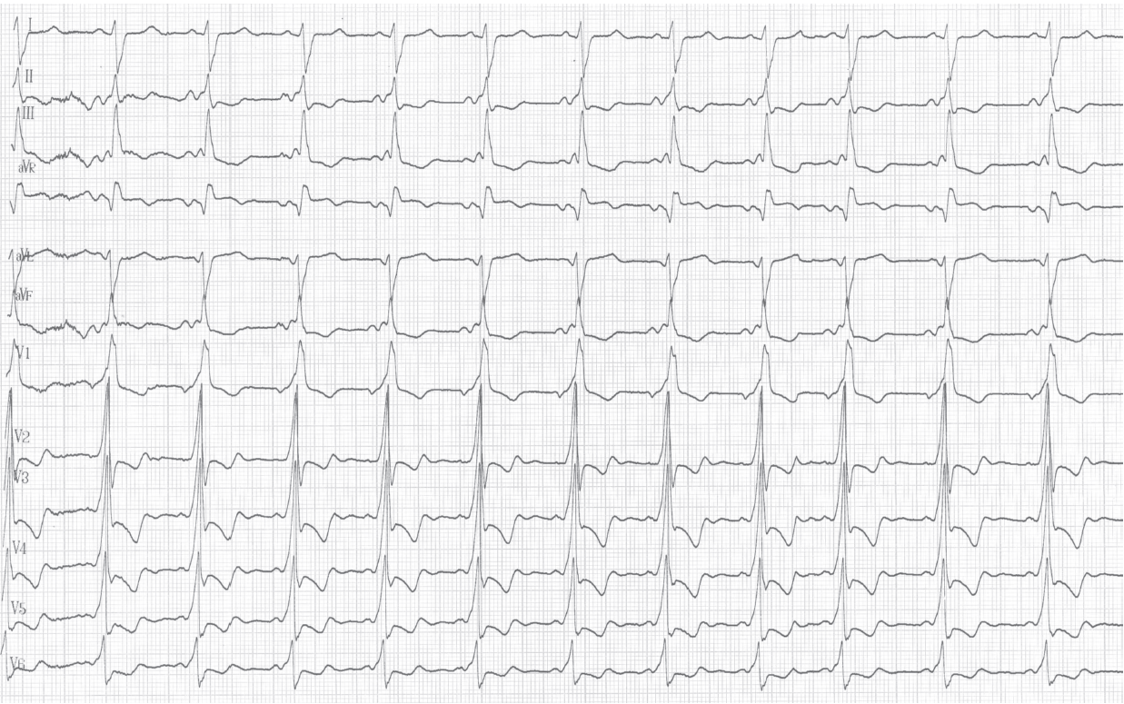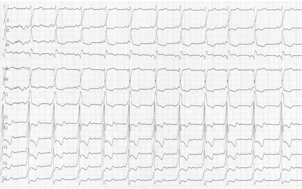 Ce premier tracé réalisé à l’arrivée aux urgences montre un tracé typique de voie accessoire latérale gauche (PR court et onde delta) avec un aspect de pré-excitation majeure et un QRS très élargi;