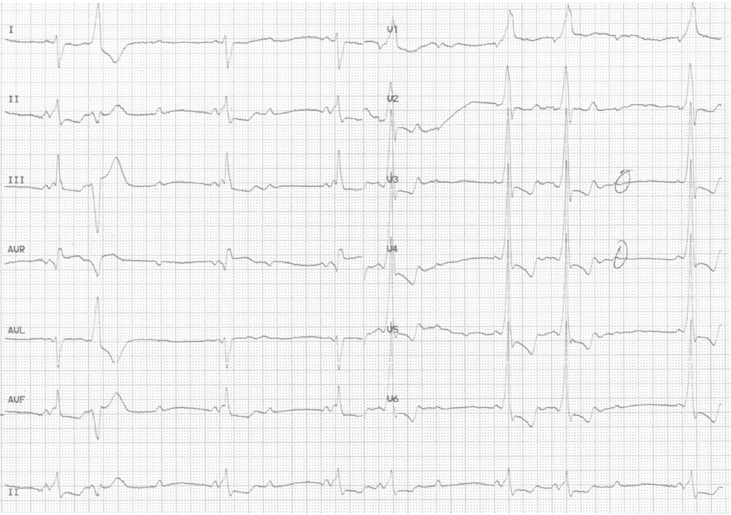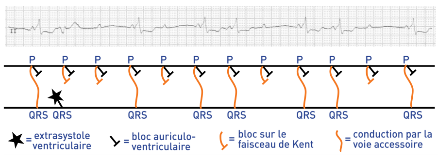 Chez un patient avec syndrome de Wolff-Parkinson-White, la conduction en rythme sinusal se fait habituellement par 2 voies différentes, le nœud auriculo-ventriculaire et le faisceau de Kent, le QRS traduisant la fusion de ces 2 activations. Cette observation documente un cas rare de bloc auriculo-ventriculaire complet sur la voie hisienne associée à un bloc du second degré sur la voie accessoire. La conduction antérograde est donc interrompue de façon paroxystique entrainant la survenue de lipothymies. Le bloc auriculo-ventriculaire complet pouvait déjà être évoqué devant l’aspect de super-Wolff sur le premier tracé ce qui est rare dans le cadre d’une voie accessoire latérale gauche. Les patients avec syndrome de Wolff–Parkinson–White se plaignent beaucoup plus de palpitations et d’épisodes de tachycardie que de problèmes de bradycardie. En effet, la voie accessoire a normalement un effet protecteur devant la survenue d’un bloc de conduction sur la voie nodo-hisienne. Devant un épisode de syncope, la survenue d’une tachycardie rapide (orthodromique, antidromique ou sur fibrillation auriculaire) est généralement suspectée. Chez ce patient, un trouble de conduction survenant sur les 2 voies était responsable des symptômes ressentis. Un stimulateur cardiaque double chambre a été implanté et les contrôles à distance ont montré un pourcentage de stimulation ventriculaire élevé témoignant de l’existence d’un trouble de conduction permanent.