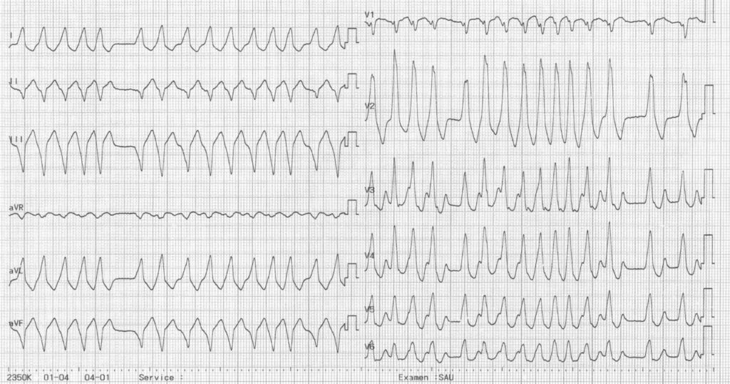 Aspect caractéristique de fibrillation auriculaire sur voie accessoire; tachycardie irrégulière avec cycles RR très courts (cycles mesurés à 200 ms) avec variations cycle à cycle de l’aspect des QRS avec complexes QRS fins, QRS très pré-excités et QRS intermédiaires;