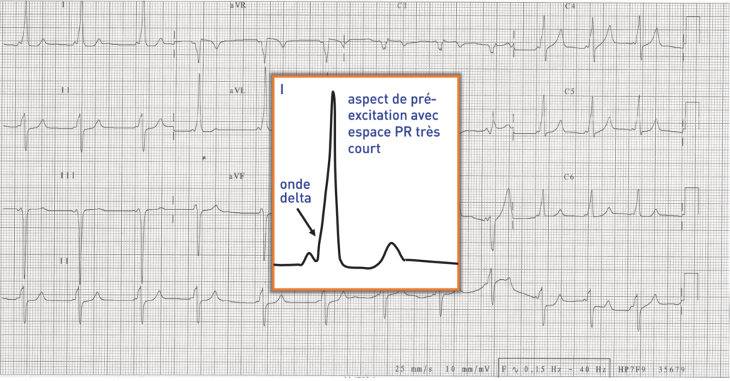 Rythme sinusal; aspect de pré-excitation avec espace PR très court, onde delta; déviation axiale gauche du QRS; aspect Qs en V1, QR en V2; probable voie accessoire postéro-septale droite