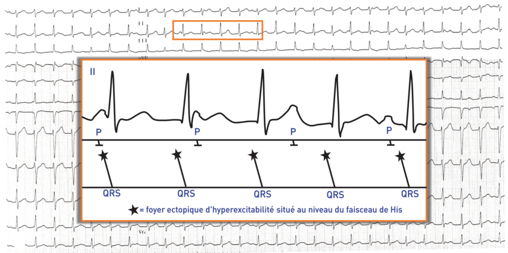 Quand le début d’un épisode d’arythmie est enregistré, un phénomène d’échauffement avec accélération progressive de la fréquence est fréquemment observé. L’arythmie commence par une extrasystole jonctionnelle suivie, sans phénomène d’écho, par d’autres extrasystoles identiques qui s’enchainent avec une fréquence croissante pour atteindre une fréquence stable. Un phénomène de refroidissement (décélération progressive de la fréquence) peut également être observé en fin d’épisode. Le diagnostic peut être confirmé en salle d’électrophysiologie avec l’impossibilité d’induire ou de réduire l’arythmie par stimulation atriale/ventriculaire (à la différence des tachycardies par réentrée) ou par choc électrique. L’injection d’Adénosine ne permet pas d’interrompre la tachycardie mais peut bloquer la conduction rétrograde quand il existe un rapport 1/1. La tachycardie persiste alors avec une dissociation ce qui permet d’éliminer le diagnostic différentiel de tachycardie par réentrée sur voie accessoire. Une stimulation atriale prolongée plus rapide que la fréquence de la tachycardie peut permettre de capturer les voies de conduction et de rétablir un synchronisme atrio-ventriculaire.