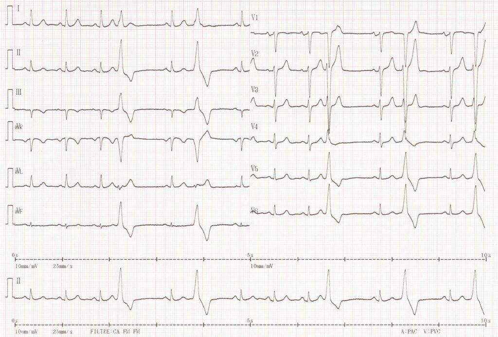 Cet électrocardiogramme suggère la présence d’extrasystoles ventriculaires provenant de l’infundibulum du ventricule droit (retard gauche, grandes ondes R dans les dérivations inférieures, transition relativement tardive R/S>1 en V4) sans critères de gravité (extrasystoles monomorphes, fines et électrocardiogramme basal sans signes évocateurs de dysplasie arythmogène du ventricule droit);