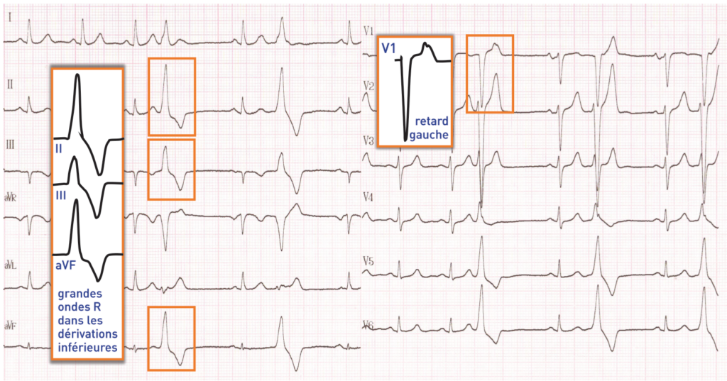 Une tachycardie ventriculaire infundibulaire survient préférentiellement chez un patient jeune sans cardiopathie avec un aspect électrocardiographique caractéristique: tachycardie monomorphe, QRS peu élargis, retard gauche et axe inférieur, dissociation auriculo- ventriculaire. Une transition précordiale (R/S>1) tardive (en V3, V4 ou V5) est en faveur d’une origine infundibulaire ventriculaire droite.