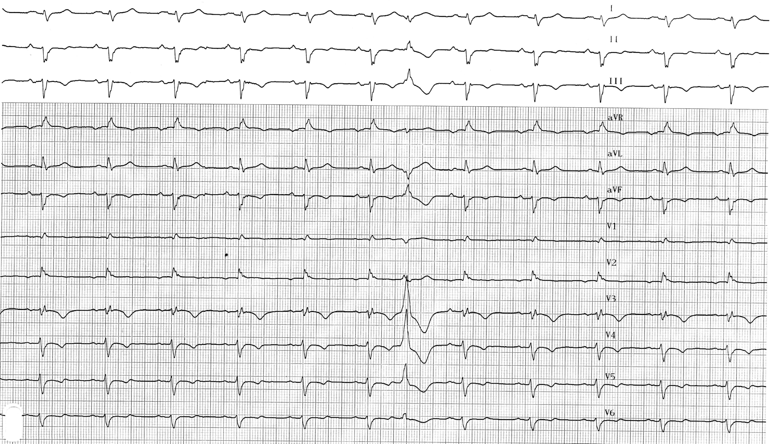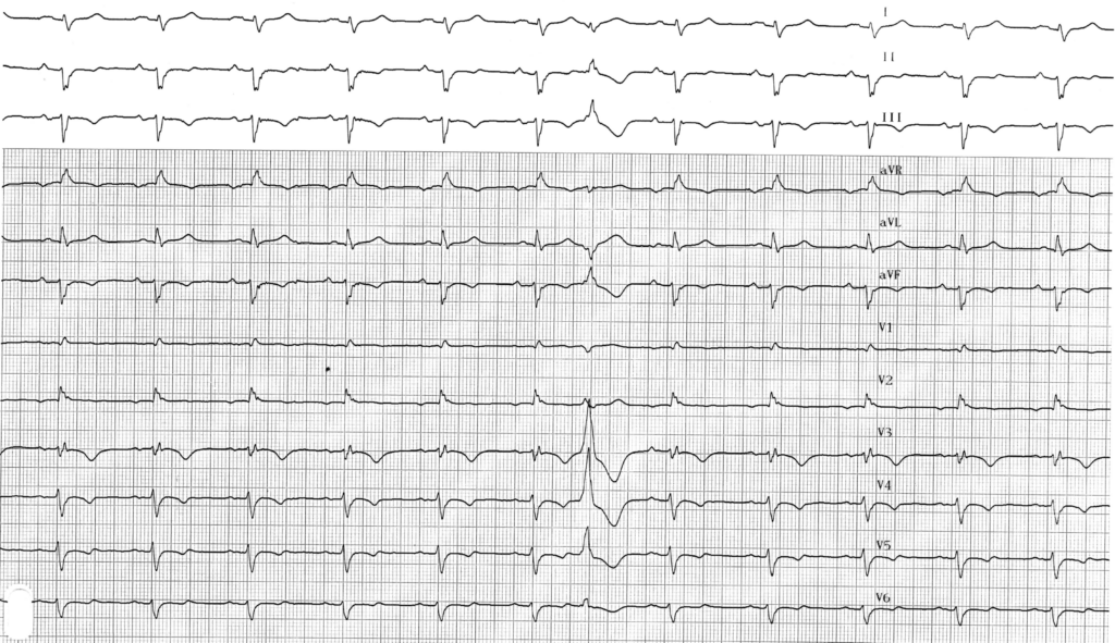 Le patient est stimulé dans l’oreillette par son défibrillateur avec une activité atriale large et fragmentée; les ventricules sont spontanés; l’axe est hyper-droit avec des QRS peu voltés dans le précordium et un aspect de retard droit; possible onde epsilon en fin de QRS; ondes T négatives dans tout le précordium et dans les dérivations inférieures;