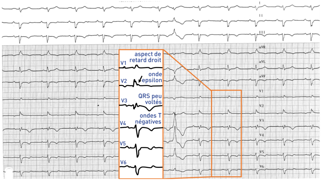 L’électrocardiogramme en rythme sinusal d’un patient avec dysplasie arythmogène peut mettre en évidence: une onde epsilon (signe spécifique mais peu sensible), une inversion des ondes T dans les dérivations précordiales droites, un bloc de branche droit complet ou incomplet, des extrasystoles ventriculaires avec retard gauche monomorphes ou polymorphes.