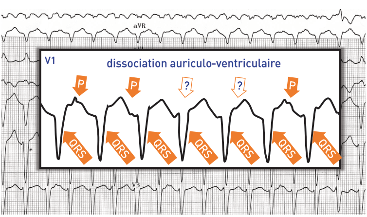 Tachycardie ventriculaire relativement lente (130 bpm) avec retard gauche; transition du QRS (R/S>1) en V5 (tardive); dissociation auriculoventriculaire signant le diagnostic de tachycardie ventriculaire (activité atriale bien identifiable en V1); ce tracé correspond à une tachycardie ventriculaire de l’infundibulum pulmonaire;