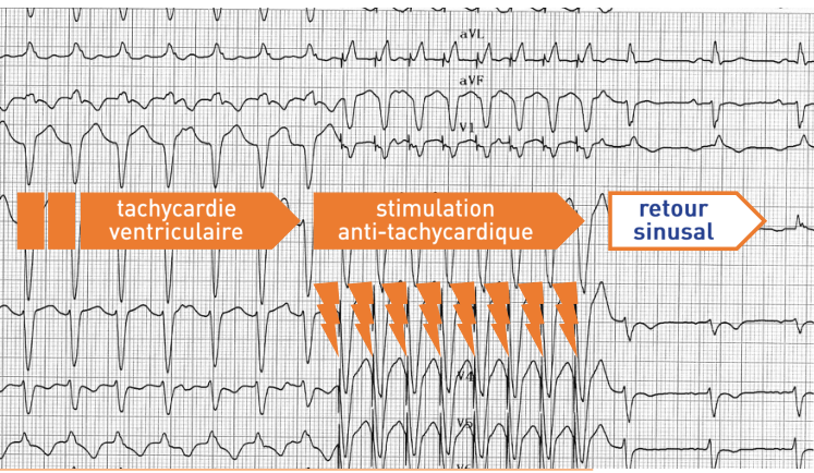 Ce tracé montre une séquence de stimulation anti-tachycardique délivrée par le défibrillateur implantable qui permet l’interruption de la tachycardie