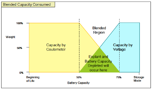 Pendant la première moitié de la vie de la batterie, la capacité consommée est le seul critère utilisé, car la tension varie peu et n'est donc pas un indicateur précis. En revanche, en fin de vie de la batterie, la mesure de la tension offre une bonne précision et est donc progressivement intégrée dans le calcul de l'estimation, jusqu'à devenir le seul critère.