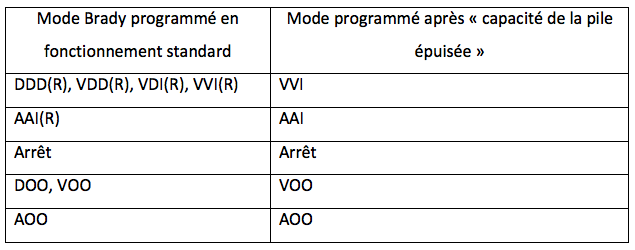 La capacité de la batterie est épuisée : les traitements ne sont plus garantis et le mode Brady est modifié ; la fréquence minimale est abaissée à 50 min-1, la télémétrie RF est désactivée et les paramètres ne sont plus programmables.