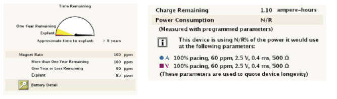 • Explantation (indicateur rouge) : la capacité restante de la batterie est suffisante pour stimuler pendant 3 mois à 100% dans les conditions actuelles, avec 1,5 heure de télémétrie sans fil.