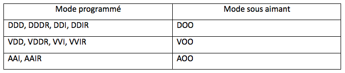 • Stimulation asynchrone : l'application de l'aimant a pour effet de convertir le mode Brady standard en mode asynchrone, avec une fréquence de stimulation fixe reflétant l'état de la batterie et un délai AV de 100 ms.