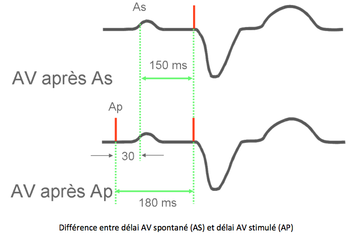 - la différence entre les retards AV détectés et stimulés dépend de la position de la sonde dans l'oreillette droite : en moyenne 30 ms si la sonde est inter-atriale, 50 ms si elle est dans l'oreillette, 70 ms à la partie haute du bord de l'oreillette droite et 90 ms si elle est latérale basse. Ces valeurs sont des moyennes, et en théorie la programmation doit être adaptée à chaque individu. Ces différences sont souvent plus importantes en cas de trouble conductif intra- et/ou inter-auriculaire.