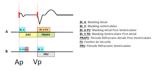 La stimulation auriculaire ou ventriculaire déclenche des blankings ou des périodes réfractaires différents dans la cavité considérée, mais aussi dans l'autre cavité afin d'éviter les écoutes croisées.