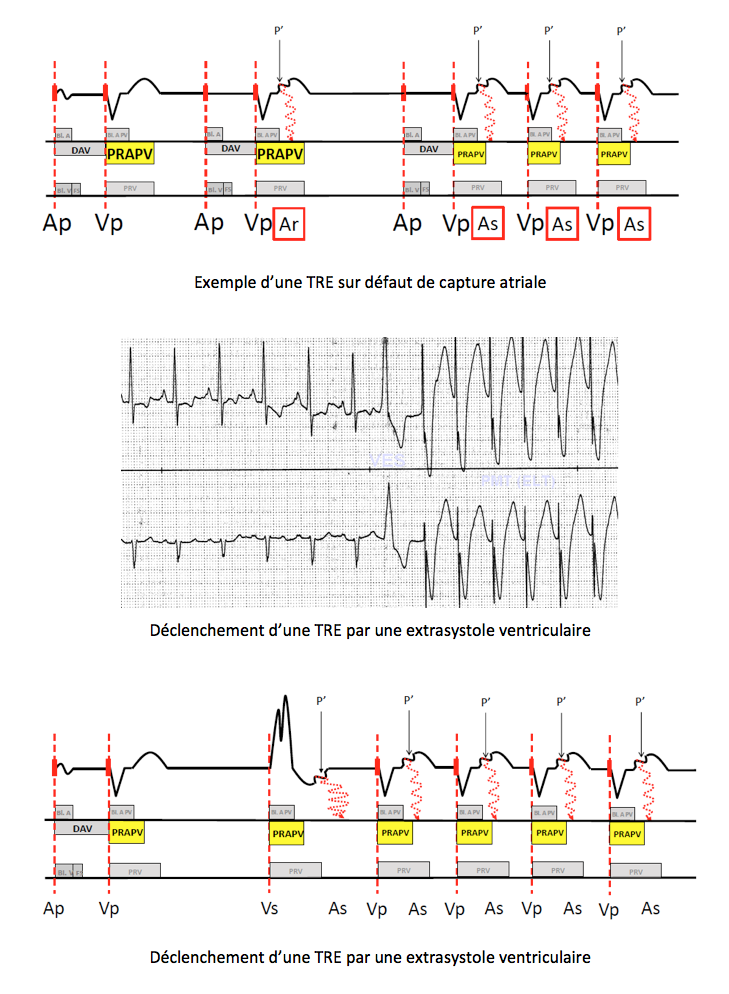 un délai AV programmé trop long (la voie nodo-hissienne est sortie de sa période réfractaire au moment de l'intervention). - stimulation ventriculaire) ;