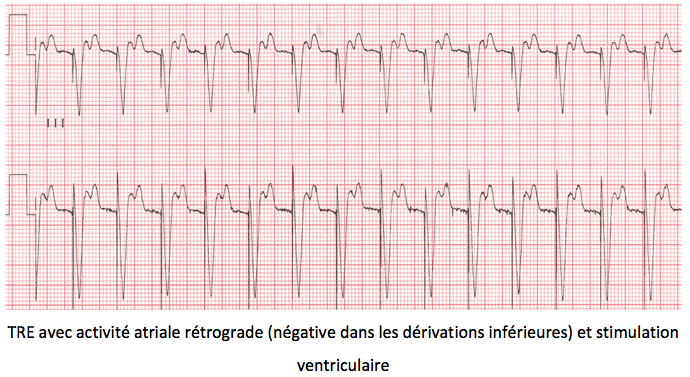 - perte momentanée ou permanente de la synchronisation atrio-ventriculaire. Si l'activité ventriculaire est correctement synchronisée avec l'activité auriculaire, la conduction rétrograde est bloquée.