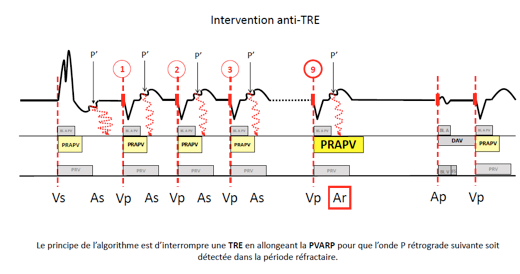 PMT Les algorithmes d'interruption varient d'un fabricant à l'autre. Le plus souvent, une fois que le diagnostic de PMT est suspecté, le stimulateur cardiaque allonge temporairement la PVARP de sorte que l'événement auriculaire suivant soit détecté dans la période réfractaire. Cet événement réfractaire n'est pas synchronisé avec le ventricule pendant un cycle, et la tachycardie est interrompue.
