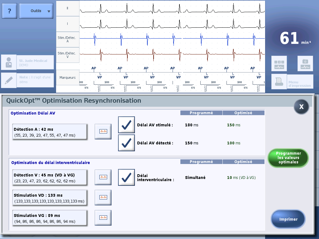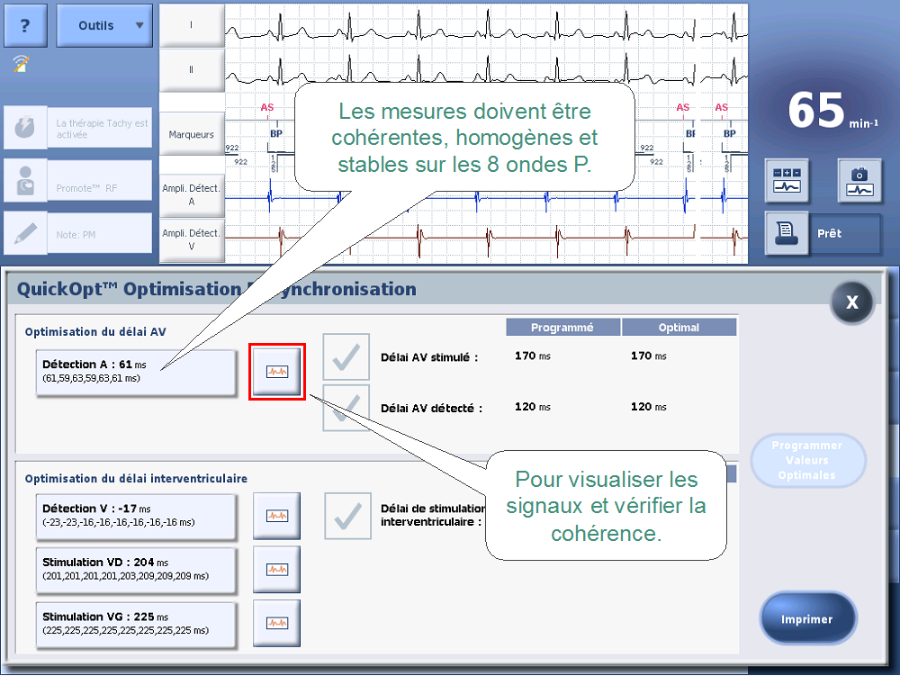 L'algorithme QuickOpt™ optimise le délai AV stimulé, le délai AV détecté et le délai interventriculaire (VV) sur la base de la mesure de la largeur de l'onde P, estimée à partir de l'EGM auriculaire (délais AV), et sur la mesure des délais interventriculaires mesurés en rythme spontané, en stimulation ventriculaire droite et en stimulation ventriculaire gauche (délai VV).