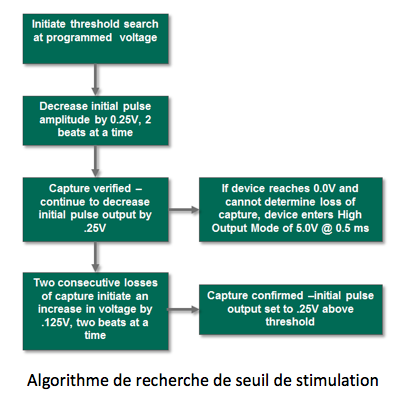Lorsque la recherche automatique du seuil est lancée (toutes les 8 ou 24 heures), l'appareil diminue l'amplitude de l'impulsion de 0,25 V tous les deux cycles. Si cela entraîne une perte de capture, l'appareil émet une impulsion de secours de 5 V (marge de sécurité) 80 à 100 ms après la première impulsion de test. Si la capture est perdue sur deux cycles consécutifs à la même amplitude, l'algorithme augmente alors l'amplitude de l'impulsion par paliers de 0,125 V tous les deux cycles. Deux captures consécutives à la même amplitude doivent être confirmées pour déterminer la nouvelle valeur du seuil de stimulation. Lorsque celle-ci est trouvée, l'appareil détermine une nouvelle amplitude automatique en ajoutant une marge de travail de 0,25 V.