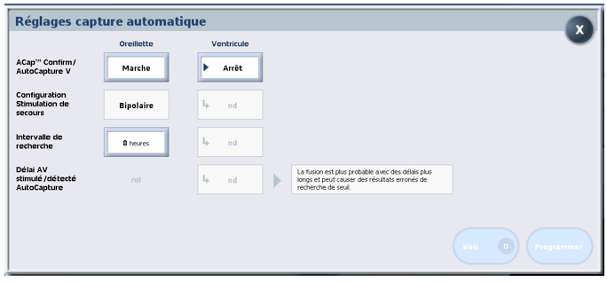 - les retards AV stimulés/détectés pour AutoCapture™ V, qui programment les paramètres de retard AV stimulé et de retard AV détecté utilisés lors d'une recherche de seuil à 50/25 ms (valeur nominale), 100/70 ms ou 120/100 ms. Le réglage recommandé pour ce paramètre est 50/25 pour éviter les fusions. Les fusions sont plus probables avec des délais plus longs et peuvent entraîner des résultats de recherche de seuil incorrects.