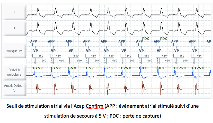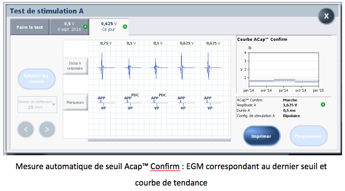 - Confirmation ACap activée : le seuil de stimulation atriale est mesuré et mémorisé automatiquement sur la courbe + adaptation automatique de la programmation ;
