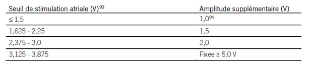 Si le seuil de stimulation déterminé par l'algorithme dépasse 3,875 V pour une certaine durée d'impulsion, la capture automatique est automatiquement désactivée et l'amplitude de l'impulsion est reprogrammée à 5 V (mode haute amplitude). Un réglage de durée d'impulsion plus élevé peut permettre de réactiver la capture automatique dans ce cas.