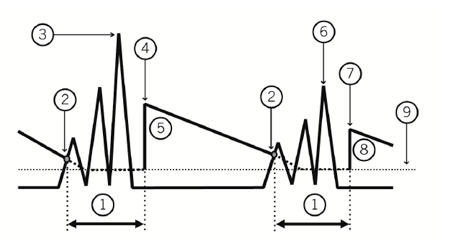 1. Suppression après détection ; 2. onde R détectée ; 3. amplitude maximale de l'onde R : 6 mV ; 4. niveau d'adaptation réglé sur 50% ; 5. sensibilité à 3 mV ; 6. onde R à 4 mV ; 7. niveau d'adaptation réglé sur 50% ; 8. sensibilité à 2 mV ; 9. sensibilité maximale ;