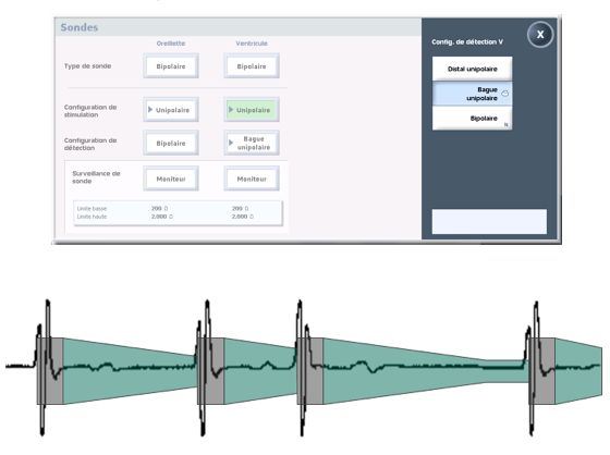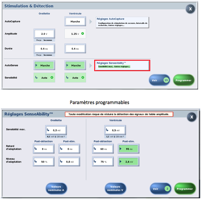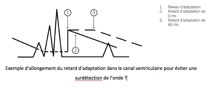 Différents paramètres peuvent être programmés pour optimiser la qualité de la détection : sensibilité maximale, délai d'adaptation (post-stimulation et post-détection), niveau d'adaptation (post-stimulation et post-détection), période réfractaire stimulée et détectée (post-stimulation et post-détection).