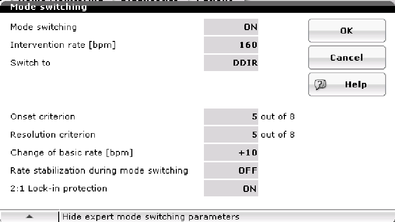 Le critère de déclenchement du changement de mode utilise un compteur roulant X de 8 avec une valeur X par défaut de 5. Cela signifie que 5 des 8 derniers événements auriculaires doivent être plus rapides que la fréquence d'intervention programmée pour que le changement de mode se produise.