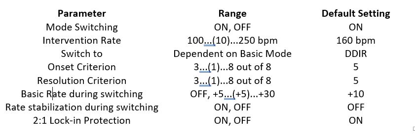 Le dispositif permet de changer de mode de stimulation en cas de tachycardie auriculaire et d'éviter de suivre des rythmes auriculaires non physiologiques dus à des arythmies auriculaires paroxystiques. Différents paramètres sont programmables.