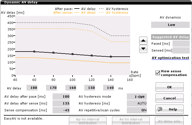 - si aucune fréquence auriculaire intrinsèque n'est mesurée ou si la fréquence auriculaire stimulée dépasse la limite supérieure, le programmateur utilise la compensation sensorielle programmée pour calculer la suggestion de retard AV correspondante.