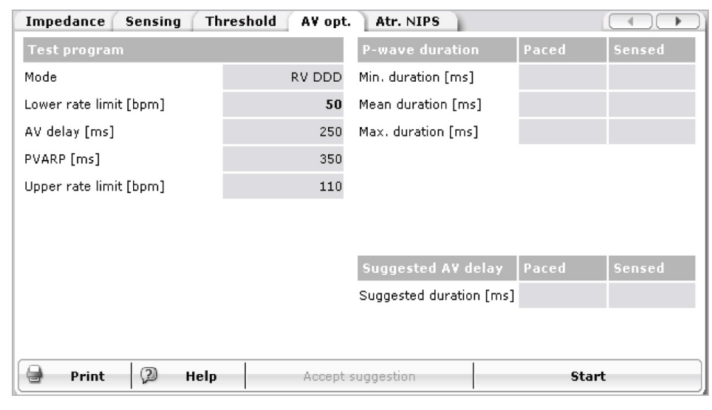 Le test AV Opt. mesure la durée de l'onde P pour les événements auriculaires stimulés et détectés et fournit des suggestions de programmation pour le délai AV stimulés et détectés. Ces suggestions visent à éviter une stimulation ventriculaire prématurée (troncature de l'onde A ; remplissage incomplet du VR) et excessivement retardée (fusion des ondes E et A ; régurgitation mitrale) à la suite d'événements auriculaires intrinsèques et stimulés. AV. Le test ne peut pas être effectué si la fréquence cardiaque est supérieure à 100 bpm ou si le patient est en mode Switch.