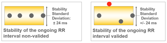Le critère de stabilité permet théoriquement de distinguer la fibrillation auriculaire (généralement irrégulière) de la TV (généralement régulière). Cependant, il ne permet pas de distinguer la tachycardie sinusale de la tachycardie auriculaire ou le flutter de la TV. Le critère de stabilité est rempli (le rythme est considéré comme stable) lorsque, pour un cycle ventriculaire, la différence entre l'intervalle RR et l'un des 3 intervalles RR précédents est plus courte que la valeur programmée. La valeur par défaut est de 24 ms. La programmation du critère de stabilité dans les zones VT1 et VT2 peut être différente. Le critère de stabilité est appliqué pendant les phases de détection et de redétection.