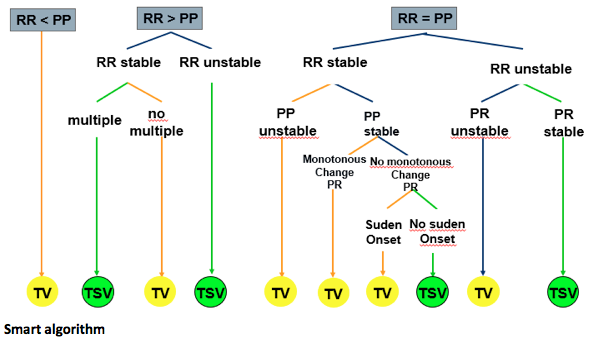 L'algorithme SMART applique plusieurs critères pour distinguer la TV de la TSV, notamment les fréquences atriale et ventriculaire, la stabilité des fréquences atriale et ventriculaire, la multiplicité, c'est-à-dire le rapport A et V n:1, et la présence ou l'absence d'une apparition soudaine de l'arythmie. En fonction de l'analyse de ces critères, l'arythmie est classée comme VT ou SVT. Pour chaque intervalle correspondant à une zone de TV, l'algorithme de discrimination effectue une série d'analyses pour conclure à un diagnostic de TV ou de TSV. Un intervalle classé comme VT est étiqueté VT1 ou VT2 en fonction de la zone de fréquence à laquelle il appartient. Un intervalle classé SVT est étiqueté “AFib” pour fibrillation auriculaire, “AFlut” pour flutter auriculaire, SinT pour tachycardie sinusale, ou 1:1 pour tachycardie auriculaire.