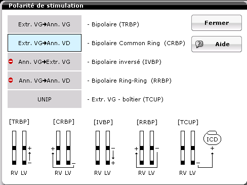 Il convient de noter que pour les stimulateurs cardiaques triple chambre, une configuration supplémentaire (six au total) peut être ajoutée : anneau/chemin LV.