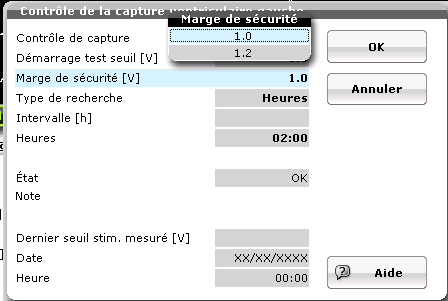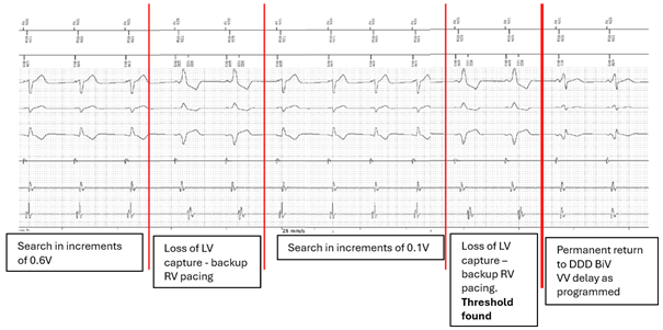 La mesure du seuil est basée sur l'analyse de la réponse évoquée, mais il n'y a pas de contrôle cycle par cycle de la capture. Le seuil est mesuré une fois par jour, à l'heure programmée (par défaut 2:00 AM). L'évaluation du seuil commence à l'amplitude de départ programmée (par défaut 3,0 V) avec une diminution de l'amplitude par pas de 0,6 V puis par pas de 0,1 V. Pendant la mesure du seuil, le délai VV est programmé à 50 ms (pré-excitation gauche). Lorsqu'une perte de capture ventriculaire gauche est diagnostiquée, la stimulation droite se produit à la fin du délai VV (pour éviter l'absence de capture ventriculaire sur un cycle chez les patients dépendants).